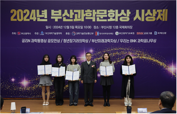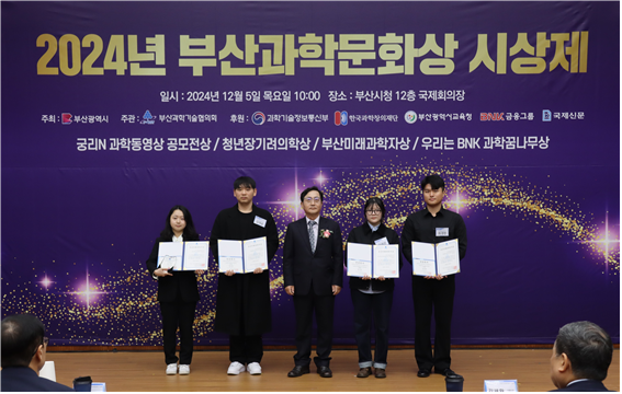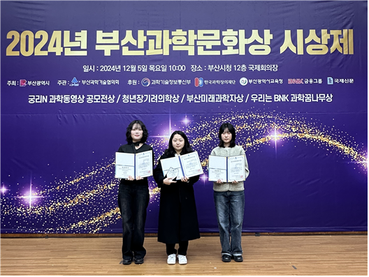 지난 12월 5일 오전 10시, 부산광역시청 12층 국제회의실에서 진행된 ‘제20회 부산 미래과학자상’ 시상식에서 동의대 응용화학ㆍ식품공학과 김승주 씨가 석사 과정 공학 부문 최우수상을, 응용화학과(2025년 화장품공학과 변경 예정) 박수빈 씨와 백소연 씨가 각각 학사 과정 이학 부문 우수상을 수상하였다.