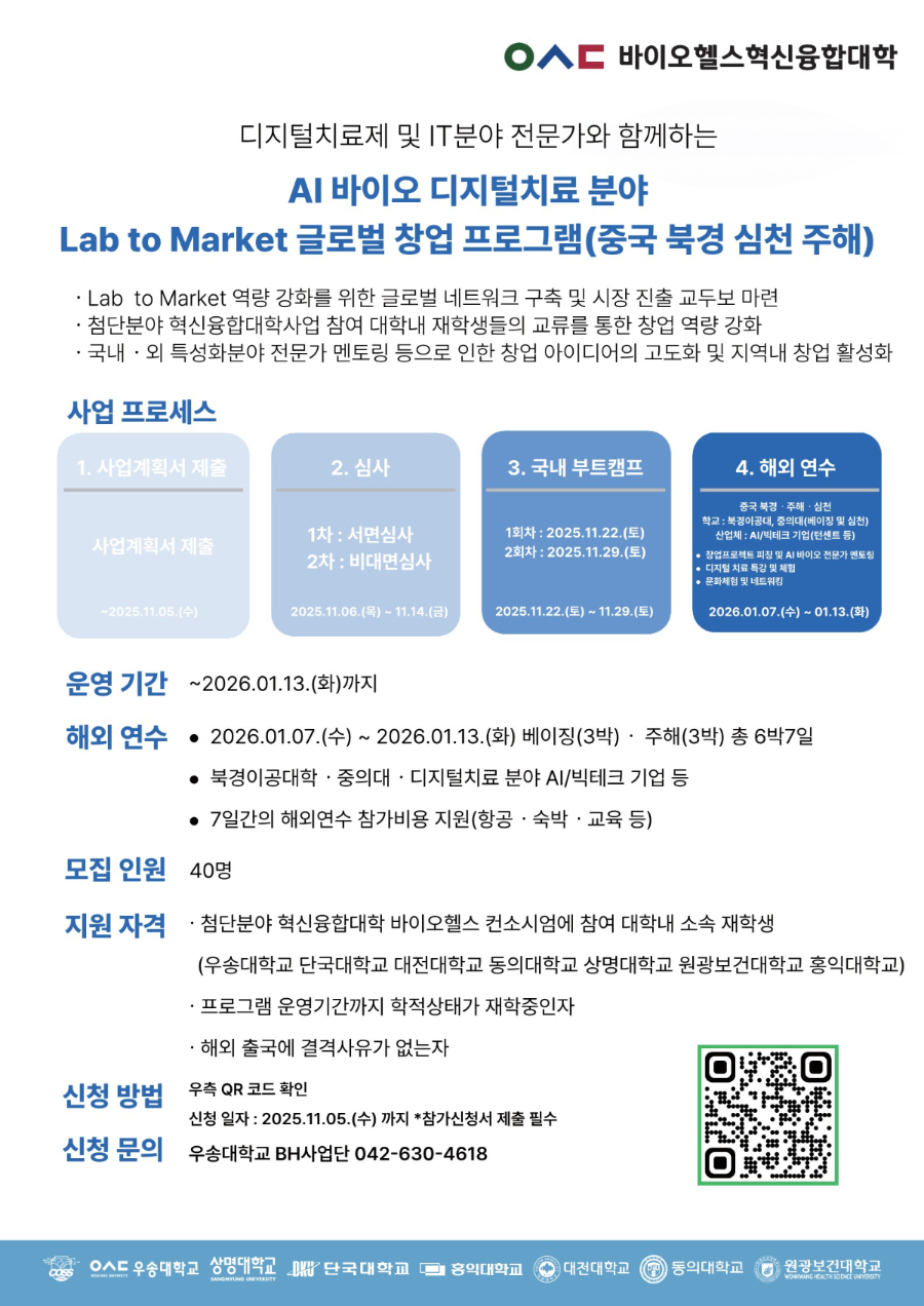 우송대학교 바이오헬스 혁신융합대학사업단에서 2025년도 해외 비교과프로그램 'AI 바이오 디지털치료 분야 Lab to Makret 창업 프로그램'