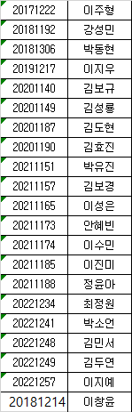 12월 03일 11시경까지 논문 및 대체물 제출한 학생 명단입니다.