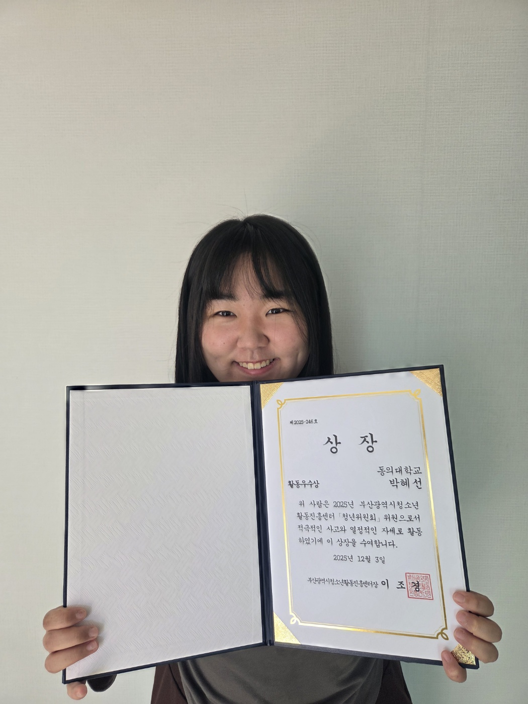 박혜선(20230260) 학생이 부산광역시 활동 진흥센터 청년위원회 활동 우수상을 수상하였습니다.