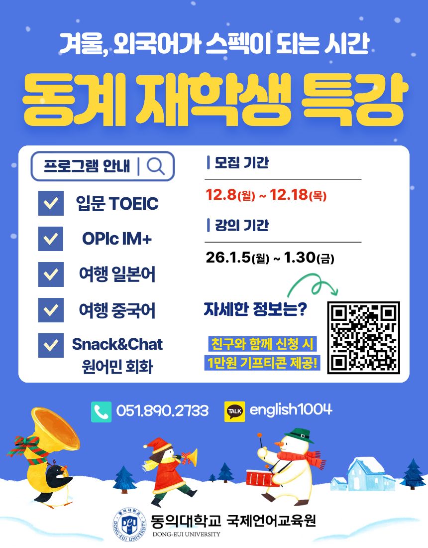 국제언어교육원에서는 2025학년도 동계 외국어 특강 수강생을 다음과 같이 모집하오니 재학생분들께서는 많은 지원바랍니다.