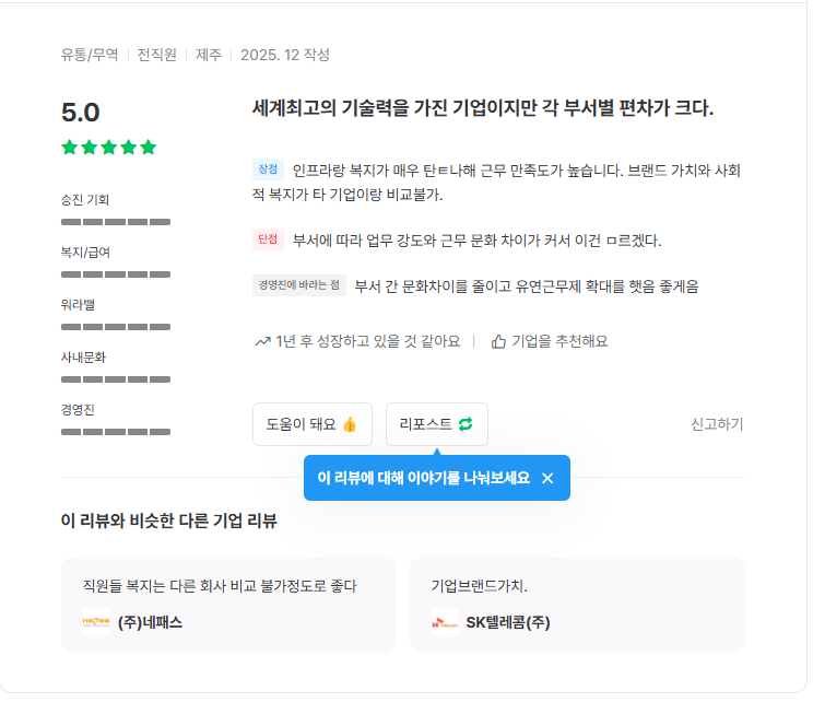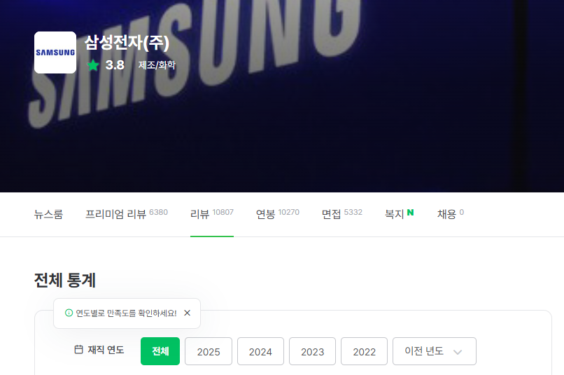 5. 제대로 가입 및 인증이 되었다면 아래 그림과 같이 기업 리뷰가 보여야 합니다. (예시: 삼성전자 기업 리뷰)